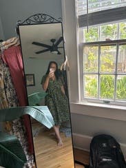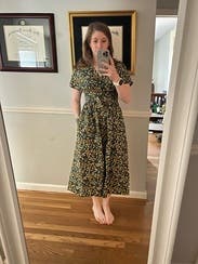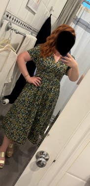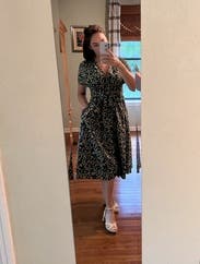 I loved this. The buckles at the waist & the fit and flare style are so cute. It was slightly large up top for me; I probably could have sized down, but it fit fine for a night at the theater. Hit me mid calf (5’2) so heels seemed necessary with the wide skirt.