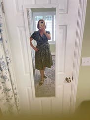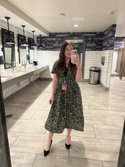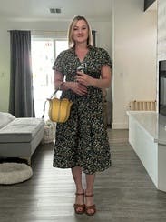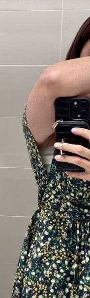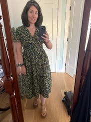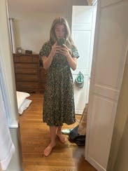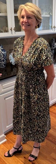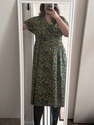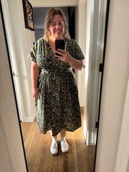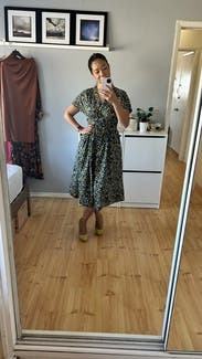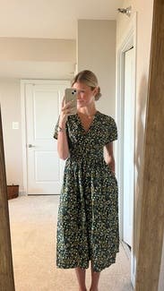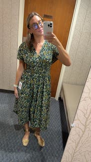 Great spring/summer dress! Have patience because the whole thing has to be buttoned! Cute pattern. Good length. Somewhat structured at the top which is nice. The “two belts” give it a nice waist and some interest! And POCKETS. A good choice for date night or a casual function!