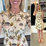 I loved the cut of this full skirted shirt dress. It fit like a glove and has great movement. The styling of the modern toile print of Parisian landmarks with a neck bow and oversized pearl buttons gives a flirty vintage vibe.