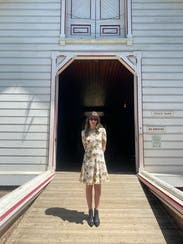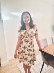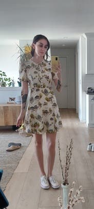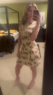 This dress was not my personal style. I didn’t like the oversized decorative pearls down the chest. Overall a bit twee. Loved the print and delicate puff shoulders. Well made/good quality. They only had a larger size available but it fit fine so maybe this brand runs small.