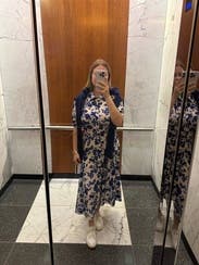 Another flattering work dress whether you're pregnant or not. I will say the size 10 was a smidge too big for me at 32+ weeks pregnant, but it didn't matter. I added a belt and it was all good. I had previously rented a Size 10 that was the perfect fit.