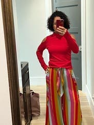 The sleeves are such a fun statement and the color is absolutely gorgeous. Very soft material. Size run true- top fits like a US 4 but very stretchy. I would definitely rent again!