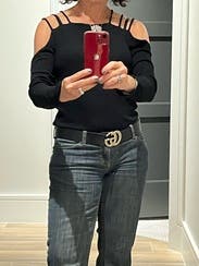 This is the most fun black shirt. I love the shoulder and arm exposure. It is a soft material. I would definitely rent this again.