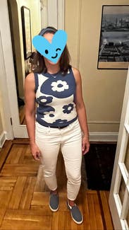 I ordered the small in this and thank goodness I didn’t order my usual XS. It barely fit ! I almost wondered if I got a XS by mistake (the size tag seems to be missing). I’m 5’2” and the length *just* meets the top of my high rise jeans; also it is not a stretchy knit and pretty form fitting . Anyway, it was cute with jeans for one of those rare days in the northeast where a sleeveless sweater makes any sense at all. Loved the colors and pattern!