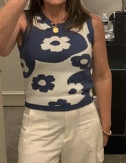 This top is adorable! So easy to dress up or dress down, It fits very true to size and so comfy. The material is knit so it's heavier than your average tank top. Very fun top!