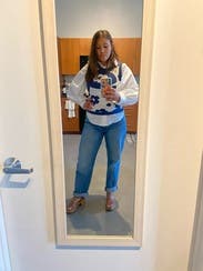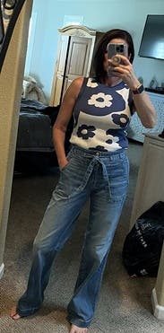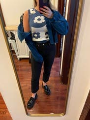 Cute sweater tank. Looked great with Levi’s overalls and high waisted jeans. If I ordered again I’d size up one, especially if you want to layer it.