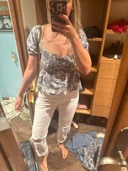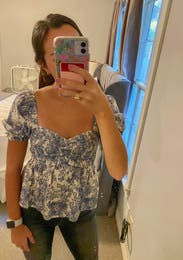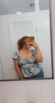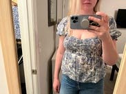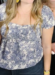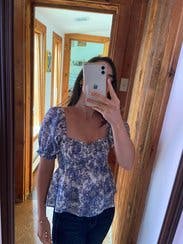 The blue floral pattern of this top is so pretty! The neckline is very flattering, and the sleeves aren't too puffy. I did have to finagle a bit to hide bra straps, so maybe opt for a strapless with this one! This is cropped, and I have a long torso, but this worked great with high waisted jeans. The only issue I had was that I noticed the fabric poufs out a bit under the bust - not the most flattering, but not bad either. The fabric is light and airy, perfect for summer.