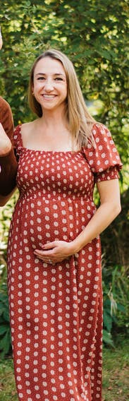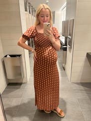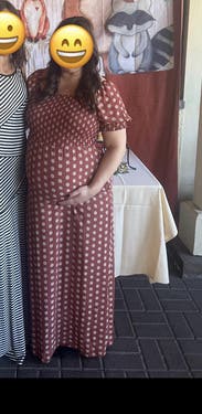 I wore this to my baby shower and was super happy with it and got several compliments on it. I'm 33 weeks pregnant and it fit perfectly. It was flowy, but still highlighted my bump and it was easy to sit down in.
