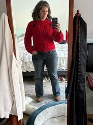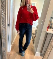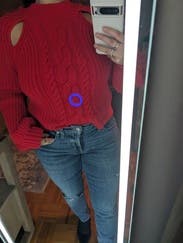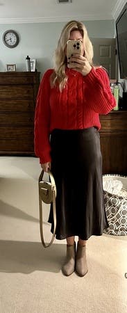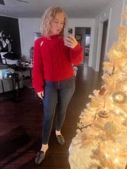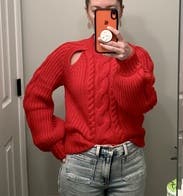 This sweater is cozy, warm but not itchy, and a beautiful red color. I just got it in a shipment yesterday but I’m sure I’ll be wearing it multiple times this cycle as it can be easily dressed up or down. The only thing I’m going to ding it on is that the peekaboo openings on the shoulders are *exactly* where my bra straps sit. I ended up wearing a bra with convertible halter straps so that they weren’t visible, but I wasn’t anticipating this was going to be one of those clothing items that would require a special bra situation. All in all though I really like this stylish sweater.