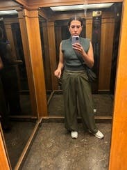 I loved this with my Eudon Choi olive pleated pants (also a RTR find). It worked for the summer despite being sweater material because it’s actually quite light. On trend!
