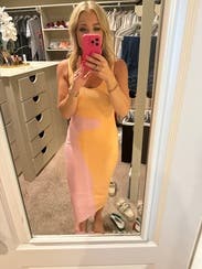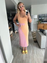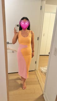 Loved this dress! It’s really soft and form fitting. The colors are super pretty and the length is great as well. Really loved this dress!
