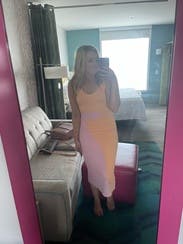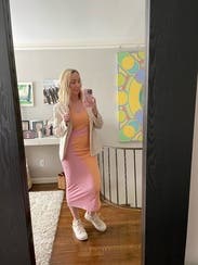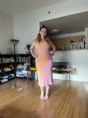 I wanted to get a picture in this dress holding a scoop of sorbet because that’s what it felt like- summery and fun. I could wear a normal bra which was great. Cute with a blazer and sneakers but I would like to rent it again and style it with heels.