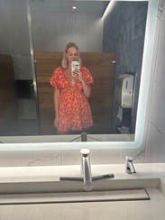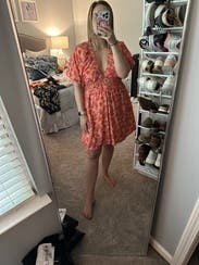 I had fun turning this dress into a “western chic” look. I paired with a brown belt and brown western boots. It was tricky pairing the right bra with the low V cut but I wore a plunge bra and added chunky necklaces to take away from the low v. I’m in between a S and XS and am tall so ordering the XS was risky regarding the length it hit me at, but the XS worked perfect for me! Would wear again!