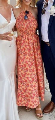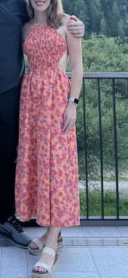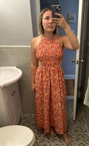 Wore this to a winery. Loved the colors on this and the fabric is nice and thick. But it was kind of heavy and the back is super backless and it felt like it was hanging low. Also the smocked part of the top was a little revealing, felt like my boob popped out underneath when I was sitting. Overall really liked it tho, got a lot of compliments.