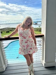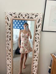 It’s super cute when you first put it on but as you walk around the bottom of this dress rides up a lot especially in the back. Didn’t end up wearing it out! I’m petite and it still felt like it was going to be too short to wear around. Won’t be reordering.