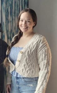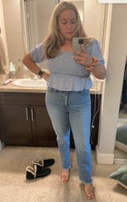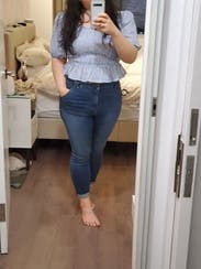 I know you can’t see the sleeve in this photo, but I wanted to show that this works on bustier ladies too. I’m between a 32D/DD. It was comfortable and it was long enough for coverage with high-waist jeans. Very cute. Loved the gingham. The elastic on the sleeves was not comfortable.