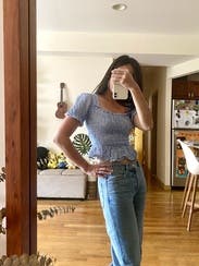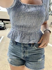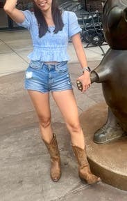 I haven't been able to pull off a smocked dress, but wanted to try the trend out, so this top did the trick! I wore a sticky bra, high waisted jean shorts and cowboy boots, and liked the overall look.