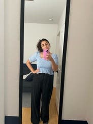 I actually didn't end up wearing this. It was cute but the fit was just ok. I should have known but the "peplum" element of it kind of made me look pregnant from the side.