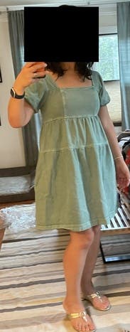 I enjoyed the subdued green denim and paired the dress with green shoes and an oversized denim jacket. Would rent again.