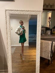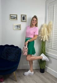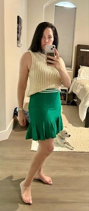 Such a sexy skirt in a beautiful green. Comfortable, not too short, very flattering. Loved it. The matching sweater is cute but I also wore the skirt on its own and liked it just as much