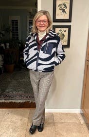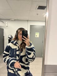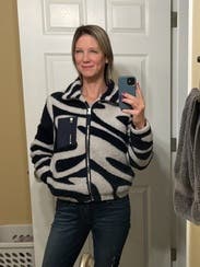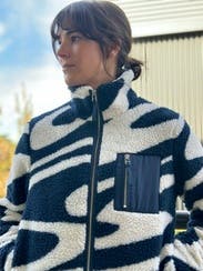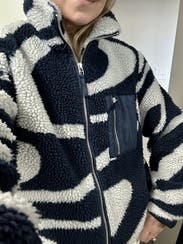 I love this as a transitional fleece.....got a million compliments too. The navy white print is cute, cozy & looks great as a casual piece.
