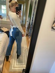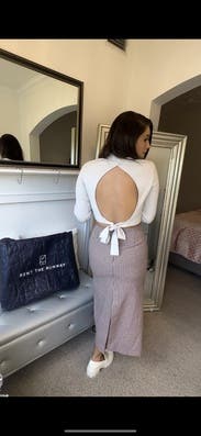 Well I got engaged in this sweater so it’s definitely a good luck charm!!! I wore it a few times while renting and loved the open back, def looks more cropped with jeans. You do need nip covers but the fabric is pretty thick otherwise. The only reason I gave this one back is bc it was still pretty expensive for the quality and the color was more dove gray than white.