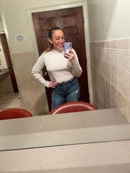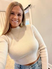 Super cute and form fitting sweater with a great back cutout. I'm probably between a s/m in tops but would recommend sizing down if you're in between because it looks better as a form fitting top!