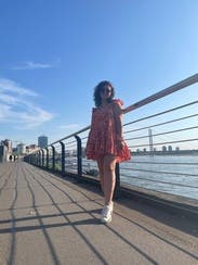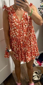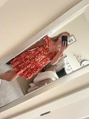 Wore on a beach vacation and felt really sweet and youthful. I love the pattern with the bright red color. I feel like the shoulder ruffles are interesting and make a subtle statement, while also being flattering. Would totally recommend renting!