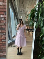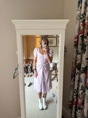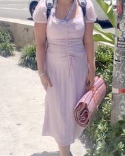 The lavender dreams vibes are strong with this one! Comfortable enough for a plane flight but the gathering and reveals are super cute. No pockets just fyi!