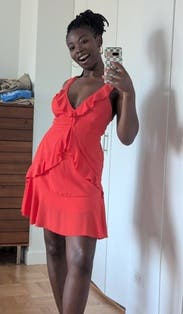 The dress is really adorable and it has a way of hiding imperfections. I rented the small and being 5 feet tall, the shoulder straps connecting to the back or just too long for me. I would have had it tailored. Did not wear because of how it looked in the back . I just gained 5 pounds… So that’s probably the reason.
