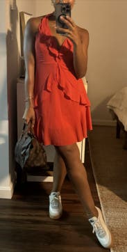 I rented this to wear to dinner with my boyfriend for my birthday, knowing the restaurant attire was a bit dressier. I wore the medium vs the large as this designer runs big. It is a fun, flattering, pretty and sexy dress that does the talking so minimal accessories are needed. You cannot wear a bra so some fashion tape and pasty like things to cover the chest area did the trick for the night for me. My boyfriend couldn't stop saying how pretty I looked and I felt that way all night.