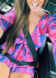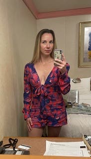 This was one of the most comfy rompers I've worn. I know others thought the top was too revealing, but I loved it. Also the ability to tie it helped make fit better and give a little lift at the same time. I love the bright colors and the mix of the low cut with the long sleeves.