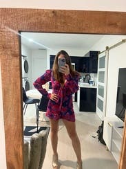 The only reason I didn’t buy this is because it’s so bright and unique and I took a bazillion pictures in it :) it fit perfect and I was even able to wear a real bra with it! I got so many compliments and was definitely feelin myself! Highly recommend. My only complaint would be the fabric wrinkles a little but the pattern and colors make it way less noticeable.