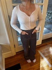 Very cute ribbed oatmeal top! I wore to work but it could easily be a great fall piece for lots of occasions. It runs large and the sleeves are very long so i cuffed them.