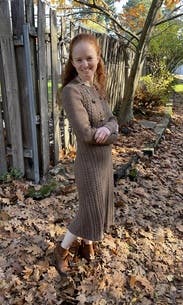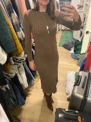 Brown knit (80% Cotton, 20% Polyester. Sleeve: 60% Cotton 40% Polyester). Sweater sheath. Long sleeves. Crewneck. Pull on. 46" from shoulder to hemline. Imported.