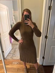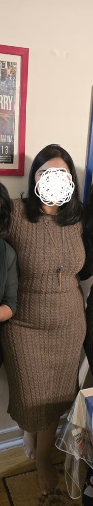 The material is VERY clingy. I would have liked to wear spanx with it but with the cut out in the back spanx would show. I liked the cable knit and the length, sleeves were a tad long but I cuffed them which was ok. Overall I liked the dress but wish it wasn’t quite so fitted. I think it’s just the fabric but definitely size up if you’re in between two sizes.
