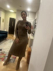 Cute dress that looked awesome with tall boots. The size M was perfect for my weight and breast size. Didn’t love the color but it was easy to wear.