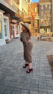 This was my first conversion to “I might be cool with a cutout during winter”. We had fake spring so it was better weather in February but still somewhat chilly. Great dress for brunch with friends. Comfy. My little line of back fat was doing its thing and the gap is actually smaller if you have a bigger booty. Very comfy dress and easy to style. 180 lbs.