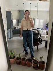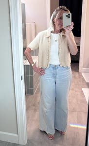I love this top. It’s light enough to wear in the summer heat and breathable. There isn’t a bottom button, so my skin showed a little more than expected. Loved the scallops and how it paired with a white skirt and white jeans. I saw some reviews that said it was boxy, but I didn’t think it was boxy. I liked that it wasn’t overly tight.