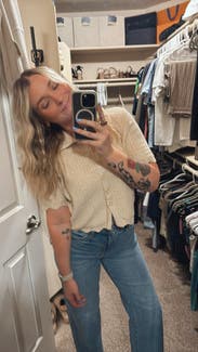 Wore this by itself and on top as a layering piece and it’s just adorable. I’m not a fan of the sleeve length on me so I won’t be purchasing but the knit and scalloping was cute