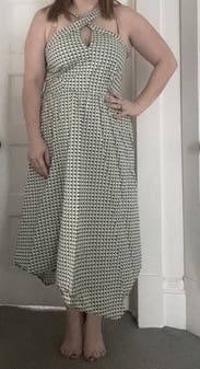 Wore this to my son’s first birthday and the vibe was right! I think it also would work in many work settings with a jacket, or as an daytime look. The straps, even when crossed, were just a little long for me so I didn’t feel like the bust fit quite right. Asymmetrical hem, print, and design is fun otherwise! As some other folks have commented, I didn’t feel that this dress was super flattering, but I got lots of compliments just the same. Sizing down may be appropriate.