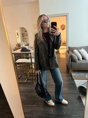 Wore this both for a work meeting with a collared sweater/slacks/heels and also out to a nice dinner with a white tee/jeans/booties Such a cool girl jacket - vintage style/fit. Love the collar line too. I'm typically between a 4 & 2, but a 2 in jackets. I got a size 2 & worked great (fit was still loose as intended).