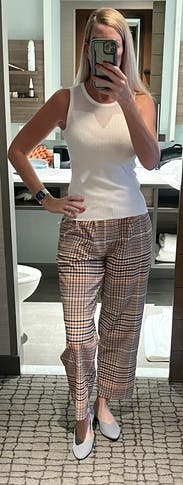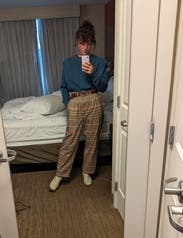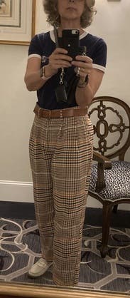 Love these pants. They’re definitely well loved, but I didn’t mind the “these were my grandpa’s pants” look. They hit my waist just right and are so comfortable for all day conference wear. I did have to hem with fabric tape in order to wear flats.