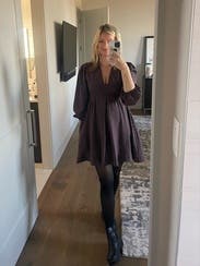 Wore for a night event with knee high boots and black tights in city then day time brunch with leggings and flats and a vest. I am tall so for length mid thigh but wore tights both times!! The design is very flattering, hides all flaws especially in stomach region and it has pockets!! Would definitely rent again!!!