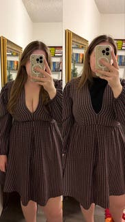 Beware if you have a larger chest like I do, this is low cut. I tried it with a little mock neck underneath and it looks fine, I can at least wear it to work that way. Otherwise, the girls are up and out. Fit is TTS and love that it has pockets!