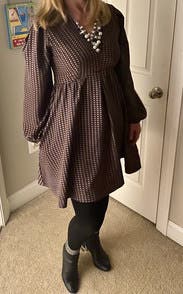 Great and perfect fit for a winery birthday vacation. Many complaints. Warmed it up with tights and boots. Great for fall or winter. Fostering as it hits high above the waist and chest pulls in just right to stay classy. Would looks cute with a floppy fedora as well. Great rent!