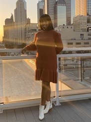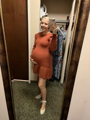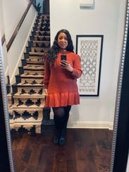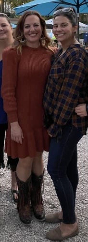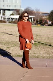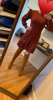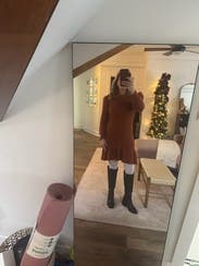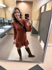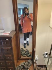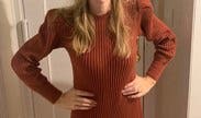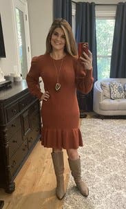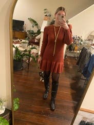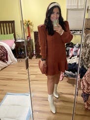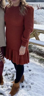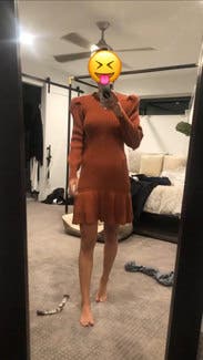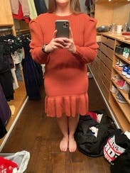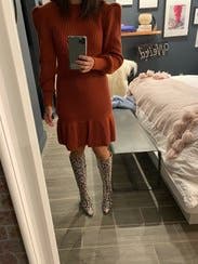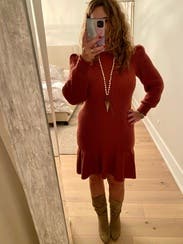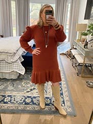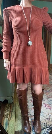 I typically never wear orange. I loved the deep rust color of this sweater dress. I received several compliments. Next time, I will size down to a medium. The dress did seem to stretch out a little over the day.