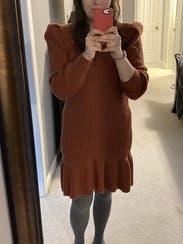 I love this terracotta color and puff sleeves detail, it's a bit loose for me. i'm between an XS and S depending on the brand, I would size down for this one. It's still a cute, warm and cozy dress.