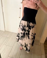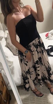 This Love, Whit by Whitney Port dress features a chic strapless black bodice and a contrasting beige floral skirt for a sophisticated, modern look. Elevate the ensemble with strappy heels and minimalist jewelry.