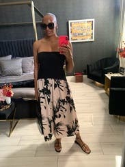 Loved how this dress fit, strapless but was not yanking it up all day, the drop waist was stretchy and the fabric of the skirt not to heavy for a day of wine tasting in 85 degree weather